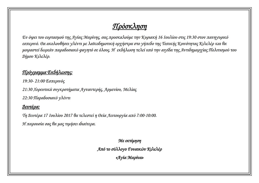 13th July Πρόσκληση του σύλλογου Γυναικών Κιλελέρ εν όψει του εορτασμού της Αγίας Μαρίνης. Προσκλήσεις Tweet Περισσότερα σε αυτή την κατηγορία: « Πρόσκληση στο festival σκόρδου Πλατυκάμπου. Πρόσκληση προς τους ωφελούμενους του προγράμματος «Εναρμόνιση Οικογενειακής και Επαγγελματικής Ζωής» του ΕΣΠΑ. »